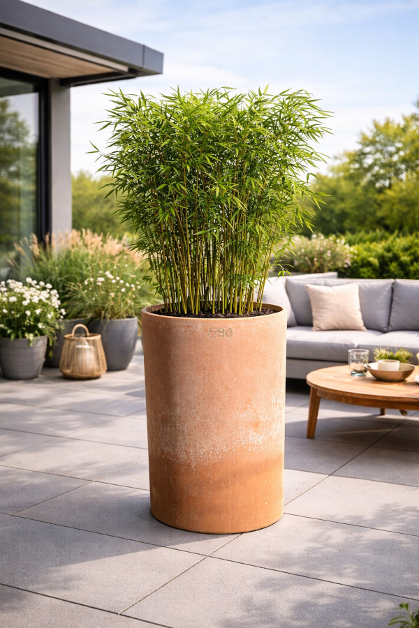 Grâce à une cuisson à très haute température, ce cylindre en terre cuite est entièrement résistant au gel jusqu’à –30 °C et convient parfaitement à une utilisation extérieure toute l’année. Il est proposé en plusieurs dimensions et finitions ; le prix indiqué correspond à la teinte terracotta classique.