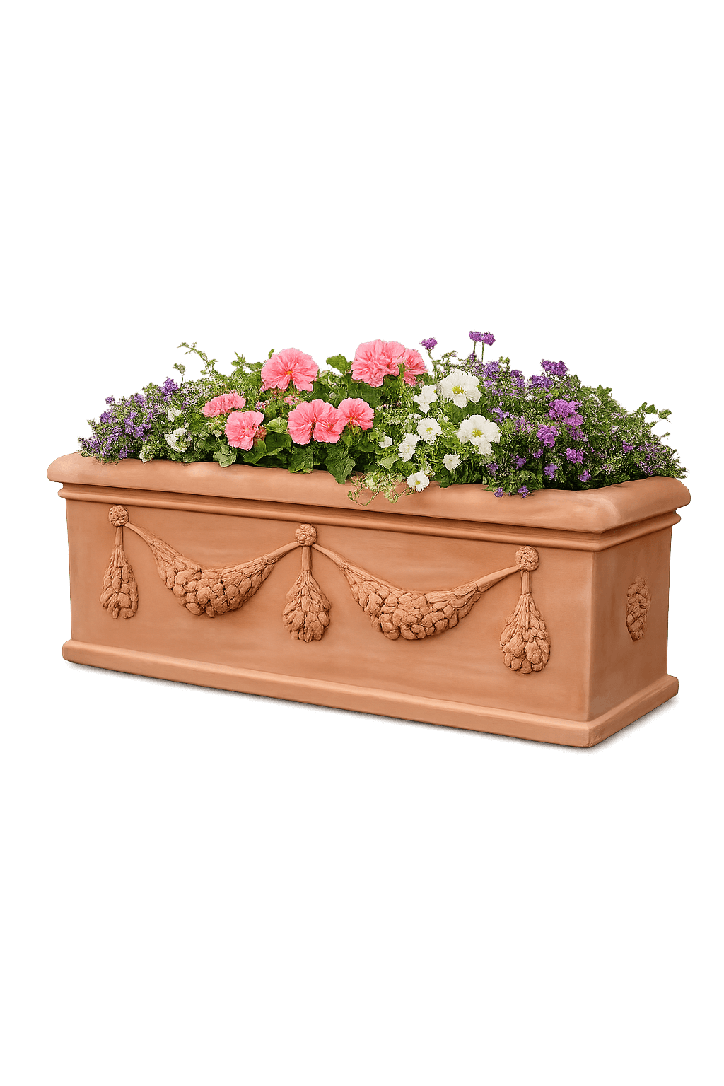 Le grand bac rectangulaire en terre cuite d’Impruneta est une pièce d’exception pour l’aménagement de jardins classiques, terrasses élégantes et patios de caractère. Réalisé en terre cuite authentique d’Impruneta, argile prestigieuse originaire de Toscane, ce bac se distingue par sa fabrication massive, sa décoration végétale abondante en rinceaux et son rebord large et marqué, à la fois décoratif et pratique.