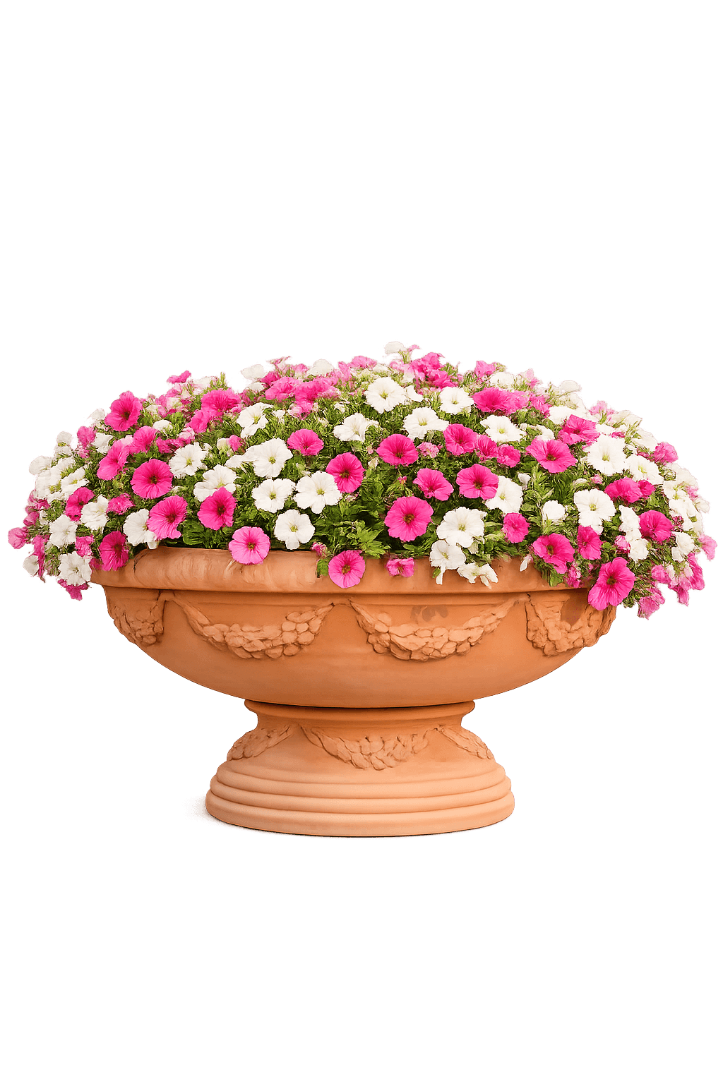 La coupe repose sur un socle orné d’une décoration typiquement italienne composée de guirlandes de fleurs et de fruits. Ces ornements floraux donnent à l’ensemble une apparence vivante et presque festive, tout en reflétant la riche tradition de l’art de la terre cuite italienne.