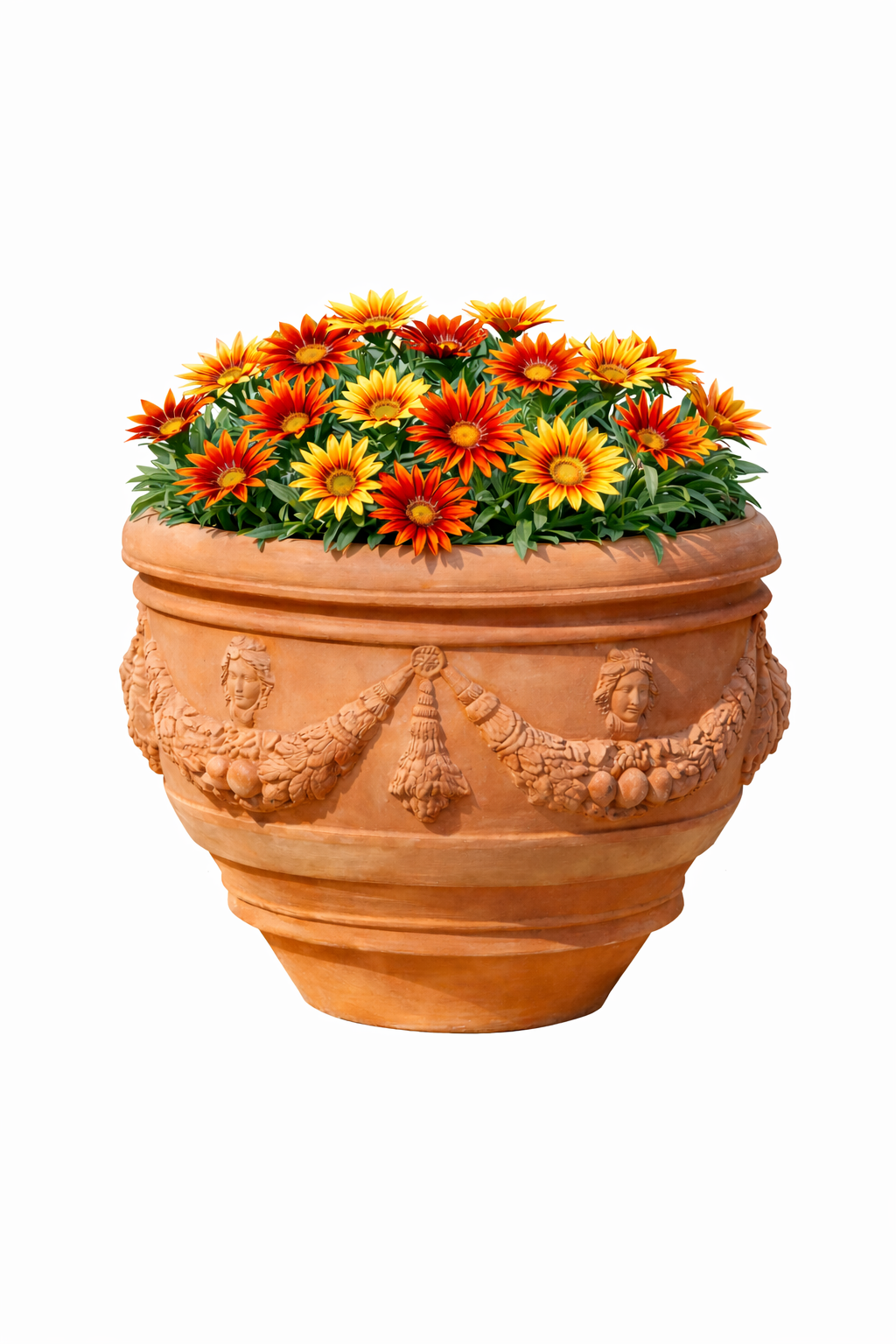 Les motifs floraux finement travaillés soulignent la silhouette harmonieuse du pot et lui confèrent une présence naturelle et vivante. Chaque détail est soigneusement modelé à la main par des artisans expérimentés en Toscane, faisant de chaque pot en terre cuite d’Impruneta une pièce unique.