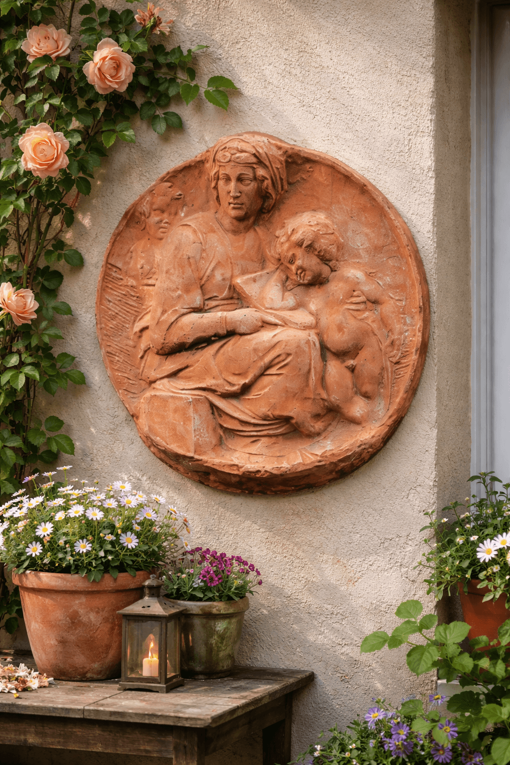 Un relief décoratif en terre cuite idéal pour apporter profondeur artistique, spiritualité et élégance classique à votre espace.