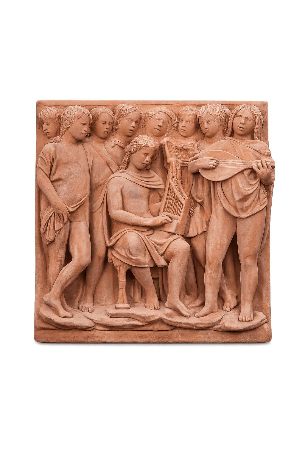 Ce relief en terre cuite d’Impruneta est une réplique artistique raffinée d’une œuvre de Luca della Robbia, dont l’original fait partie de la célèbre cantoria (tribune des chantres) du Cathédrale Santa Maria del Fiore à Florence. La composition reflète avec justesse l’élégance, la clarté formelle et l’harmonie qui caractérisent le travail de ce grand maître de la Renaissance italienne.