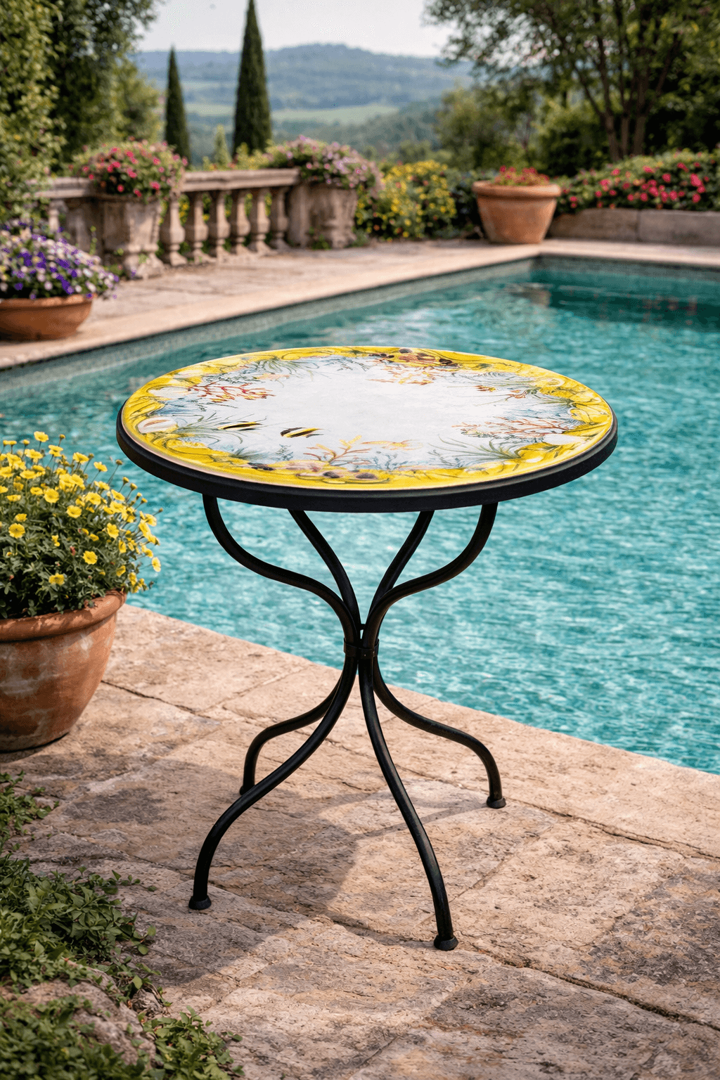 Une bordure décorative ornée de motifs floraux dans des tons jaunes chaleureux crée un contraste harmonieux avec le bleu profond du décor marin et souligne l’élégance méditerranéenne de cette table de jardin d’exception. L’émaillage de haute qualité, appliqué à la main, garantit non seulement des couleurs éclatantes et durables, mais protège également efficacement la surface contre le soleil, la pluie et le gel. La table est ainsi parfaitement adaptée à une utilisation extérieure tout au long de l’année.