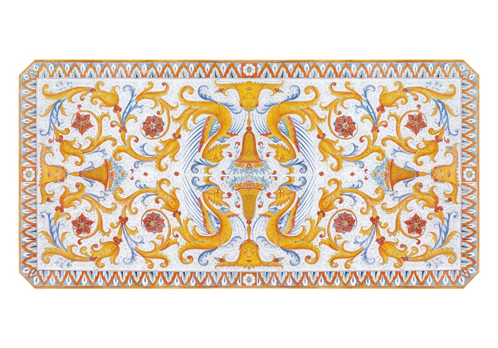 Table rectangulaire en majolique peinte à la main de Deruta – décor Raffael, chef-d’œuvre de l’art céramique italien
